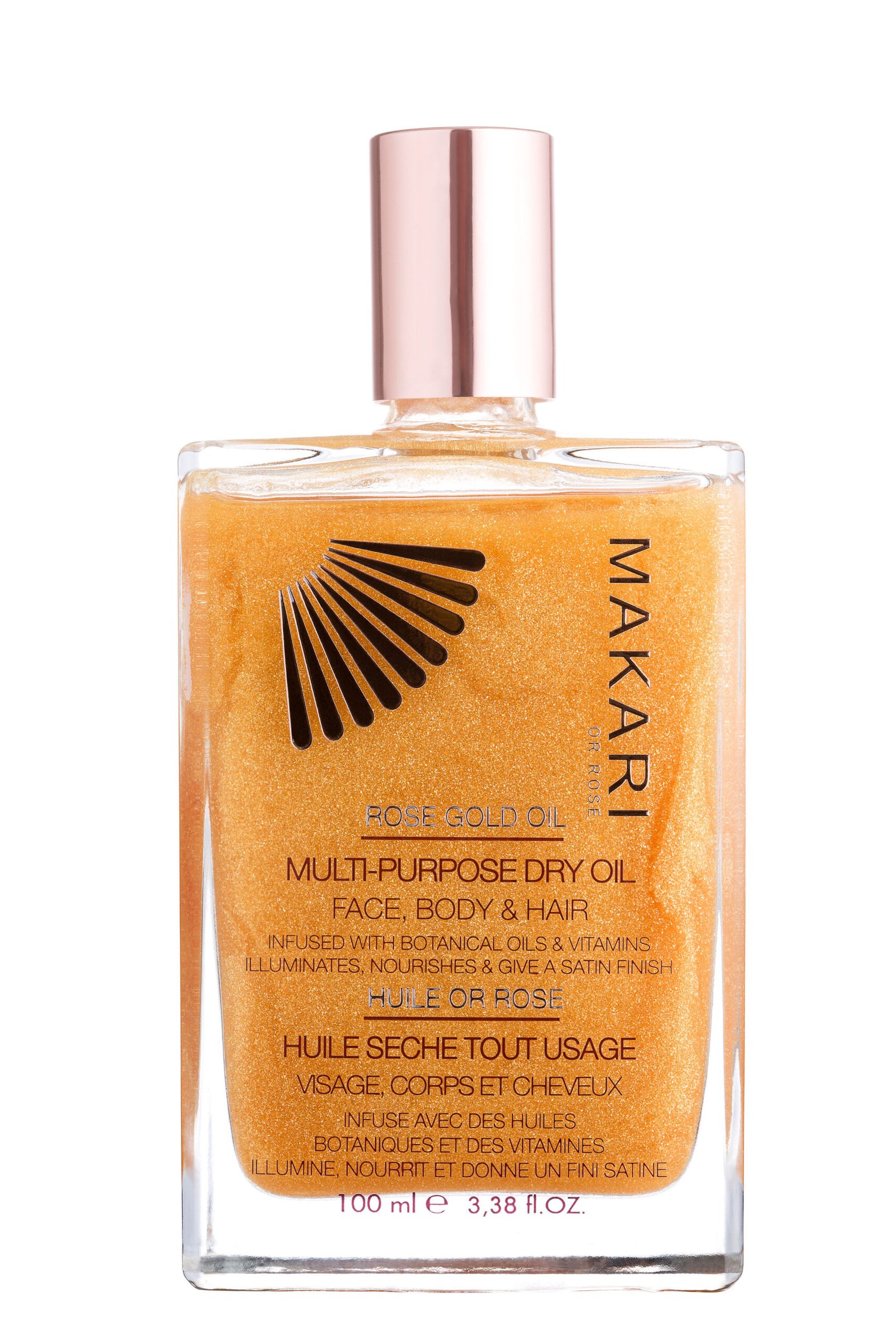 Apply a small amount of the Dry Oil directly to your face, body or hair as needed to add extra glow! Try mixing a few drops with body lotion, facial cream and/or foundation in the palms of your hands but do not mix within the bottle.